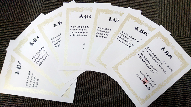 今月は、改善提案を7件いただきました。ありがとうございます。 感謝状と賞金を贈呈いたします。今後もたくさんの提案を期待しております。